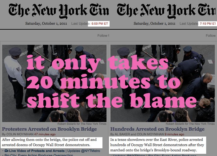 There is an image making the rounds on Facebook right now, an annotated dual screen capture of the New York Times front page story on the Brooklyn Bridge arrests that were the dramatic high point of the Occupy Wall Street protests over the weekend. The left side of the image shows a screen capture taken at 6:59 p.m., on Saturday, October 1. The lead it quotes at that time reads: